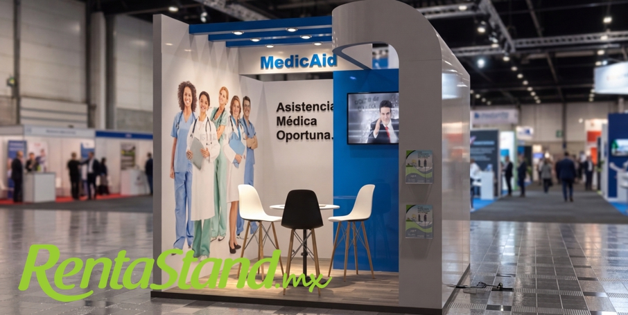 Stand ubicado en Esquina de tamaño 3x3 con una altura de 2.9 mts. Se trata de un diseño para promover servicios o marcas. Aprovecha el espacio para acomodar mobiliario o area de atención.