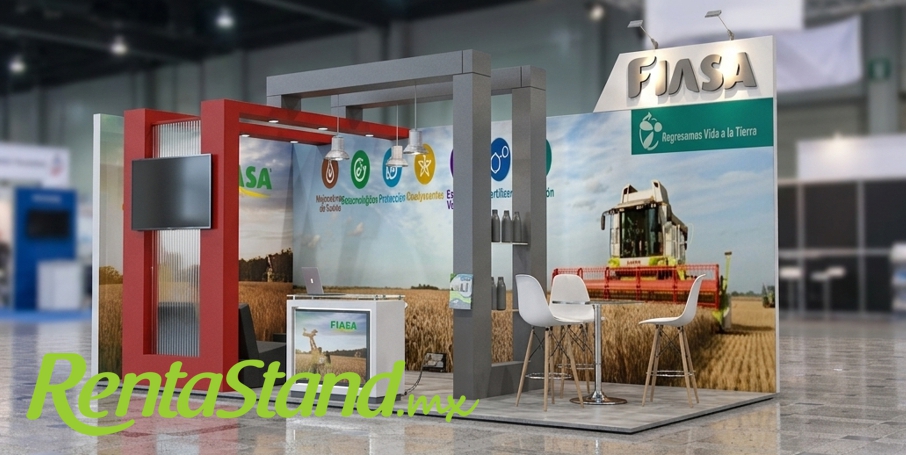 Stand ubicado en Esquina de tamaño 3x6 con una altura de 2.5 mts. Se trata de un diseño para promover servicios o marcas con gráficos en grán formato. Aprovecha el espacio abierto para acomodar mobiliario o area de exhibición complementaria.